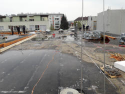 Tragwerksverstärkung einer Decke bei einem Kindergarten in Leonding. Bei diesem Objekt wurde ein neues Obergeschoss aufgebaut. Die Flächen waren mit einer Bitumen Notdeckung abgedichtet. Arbeiten: Einzelflächen genau einmessen und anzeichnen, Bitumenabdichtung entfernen, Untergrund schleifen. Einmessen der Lamellen und genau markieren, Sika Carbodur S512 CFK-Lamellen verkleben.